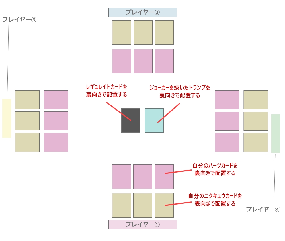 - ハーツカードが3枚表になっている状態で負けたプレイヤーは脱落となる。
